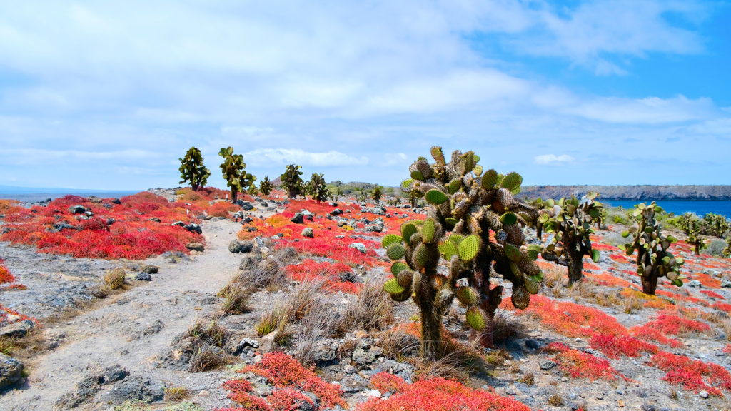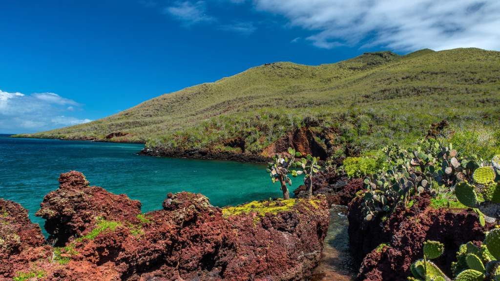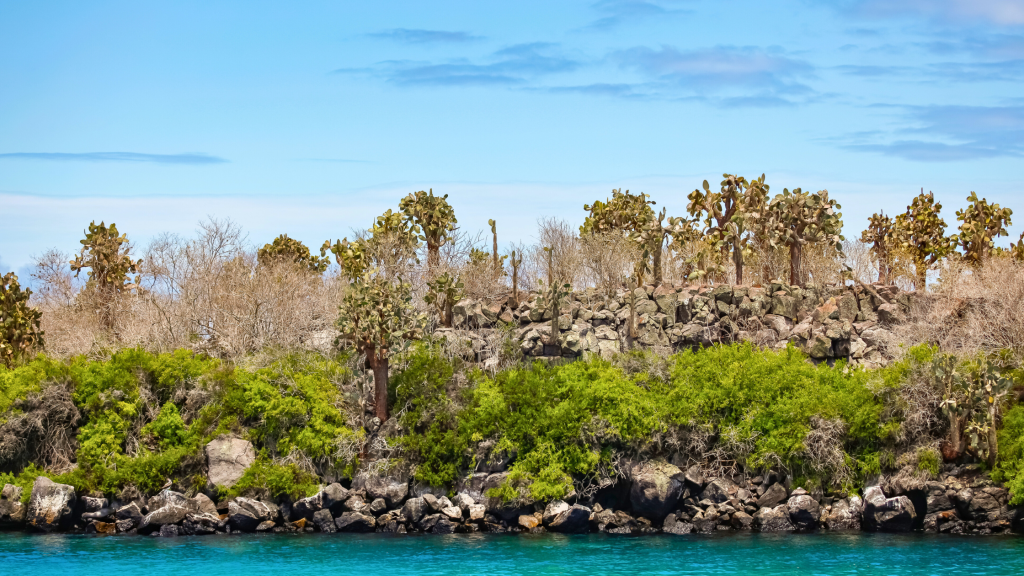 - Home to a large colony of sea lions, vibrant vegetation, and the archipelago’s only hybrid iguanas. The island’s unique vegetation includes the Sesuvium, which changes color with the seasons, and the Opuntia cactus.