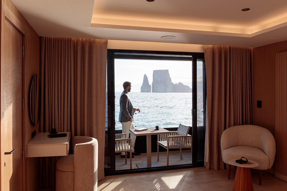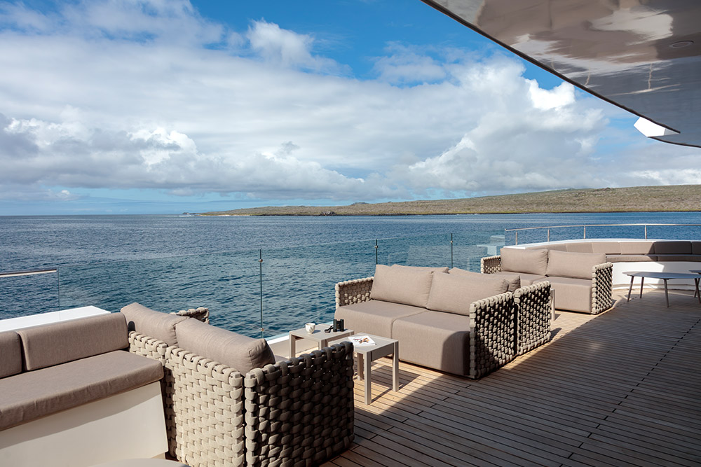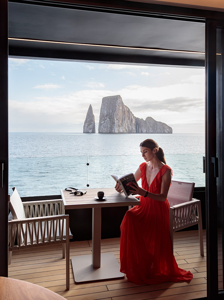 You will enjoy the private intimacy of a small, elegant yacht without compromising the sophistication of a larger cruise ship. Every moment of repose is elevated in your private sanctuary: each suite aboard this leading Galapagos Luxury Cruise features an expansive private balcony and a private jacuzzi, ensuring you have unobstructed, continuous views of the magnificent islands.