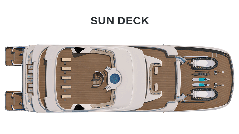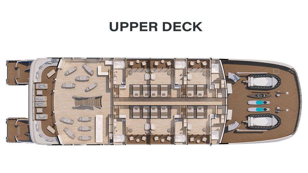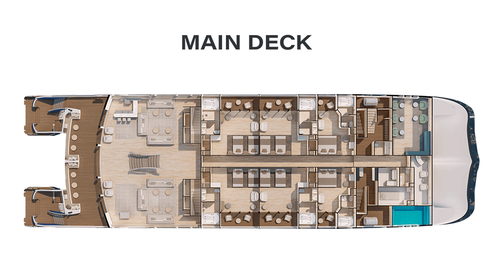 The Hermes Mega Catamaran features 12 opulent, convertible suites spread across the main and upper decks. Each suite elevates your journey on this ultra luxury Galapagos Cruise, boasting amenities like a walk-in closet, mini bar, floor-to-ceiling windows, a private balcony, and a jacuzzi. These deluxe accommodations ensure your time on board is as spectacular as the islands you explore.