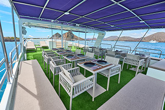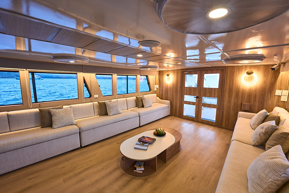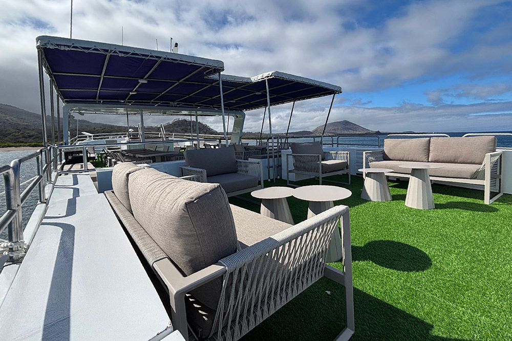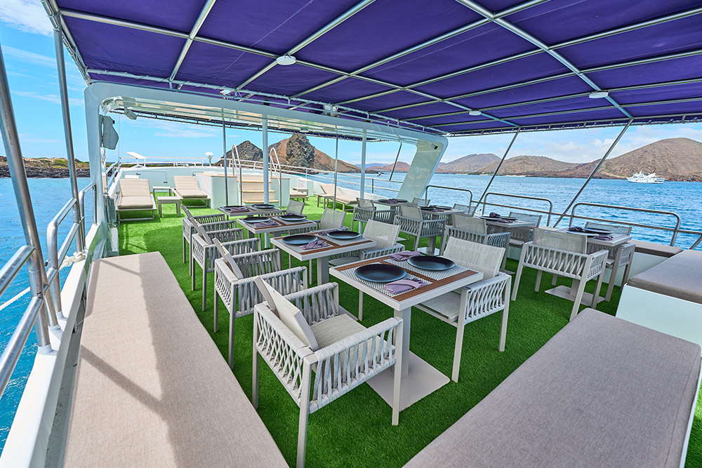 Your Galapagos Cruise experience extends beyond the islands. The Monserrat boasts numerous interior and exterior social areas, providing perfect settings to relax and reflect after a day of exhilarating exploration. Exterior spaces include a sun-drenched area on the Upper Deck and a partially covered area on the Sun Deck, jacuzzi, both featuring comfortable reclining chairs—ideal spots for soaking up the scenery or sharing tales of your wildlife encounters.